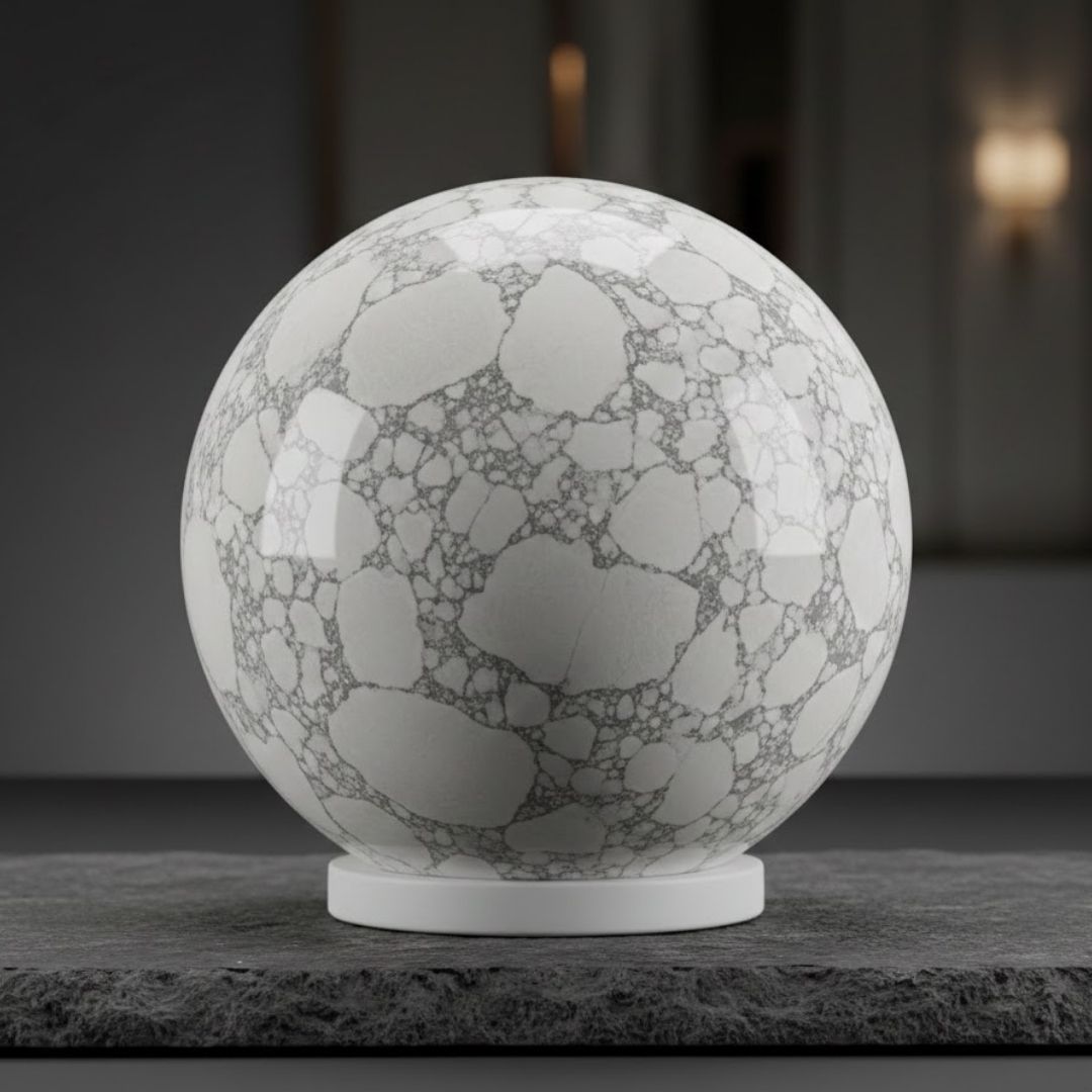 Large Howlite Sphere is a striking polished crystal featuring white tones with natural grey veining. Known for its calming presence, this sphere is ideal for décor and meditation.