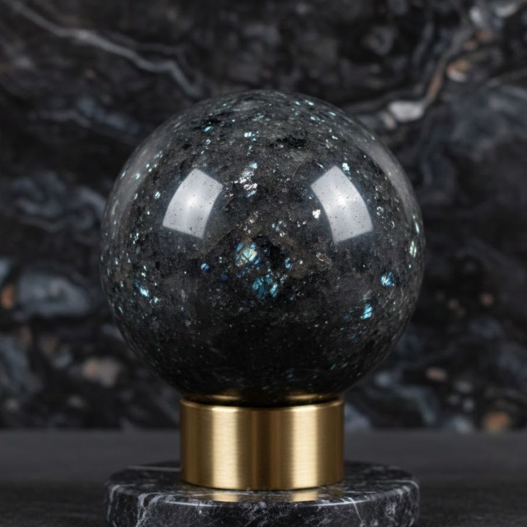 Larvikite Sphere delivers bold contrast and modern crystal elegance.